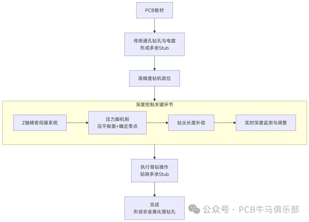 背钻工艺的实现,核心在于 “深度控制” 。这并非通过简单的机械限位来实现,而是一套集高精度机械、传感技术、软件补偿和材料学于一体的精密系统。其工作原理和流程如下图所示: